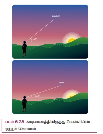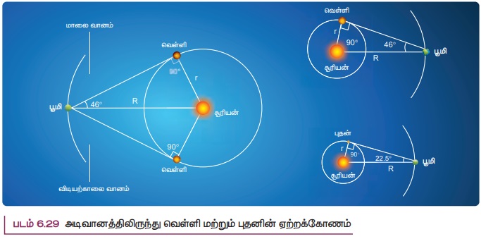 sin 46° = 0.77 என்பதிலிருந்து வெள்ளி சூரியனிலிருந்து 0.77 AU தொலைவில் உள்ளது என கணக்கிடப்பட்டது. இதே போல் θ = 22.50 என பிரதியிட்டு புதனுக்கும் சூரியனுக்கும் உள்ள தொலைவு 0.38 AU என கணக்கிடப்பட்டது. வெளிக்கோள்களான செவ்வாய் மற்றும் வியாழன் போன்ற கோள்களின் தொலைவானது சற்று மாறுபட்ட முறையில் கண்டறியப்பட்டன. அட்டவணை 6.2 இல் சூரியனுக்கும் கோள்களுக்கும் உள்ள தொலைவுகள் தரப்பட்டுள்ளன.