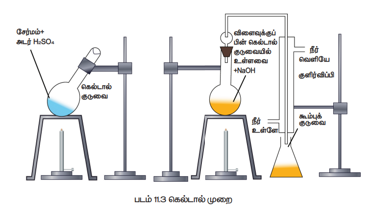 இம்முறை டுமாஸ் முறையை விட எளிதில் கையாளக்கூடியதாகும். உணவுப் பொருள்கள், உரங்கள் போன்றவற்றின் பகுப்பாய்விற்கு பெருமளவில் இம்முறை பயன்படுகிறது. நைட்ரஜன் அடங்கிய கரிமச்சேர்மத்தினை அடர் H2SO4 உடன் சேர்த்து சூடுபடுத்தும் போது, அதிலுள்ள நைட்ரஜன் ஆனது அம்மோனியம் சல்பேட்டாக மாறுகிறது. பின்னர் உருவான கரைசலை அதிக அளவு காரத்துடன் சேர்க்கும் போது வெளிப்படும் அம்மோனியா வாயுவானது அதிக அளவு திட்ட அமிலத்தால் உறிஞ்சப்படுகிறது. பயன்படுத்தப்பட்ட திட்ட காரத்தினை நடுநிலையாக்க தேவைப்படும் அமிலத்தின் கனஅளவினை தரம் பார்த்தலின் மூலம் கண்டறியலாம். இதிலிருந்து வெளியேறிய அம்மோனியாவின் அளவு கண்டறியப்பட்டு நைட்ரஜனின் எடை அறியப்படுகிறது. (படம்:11.3))