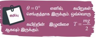 (ii)  இரண்டு கயிறுகளின் வழியே செயல்படும் இழுவிசைகள் (T)