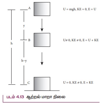 படம் 4.13 விளக்குவது யாதெனில், h உயரத்தில் ஓய்வில் உள்ள ஒரு பொருளின் மொத்த ஆற்றல் முழுவதும் நிலை ஆற்றல் (U=mgh) மட்டுமே. மேலும் h உயரத்தில் அதன் இயக்க ஆற்றல் (KE) சுழியாகும். பொருள் கீழே விழும்போது ‘y’ தொலைவில் அதன் நிலையாற்றல் மற்றும் இயக்க ஆற்றல் சுழியாகாது. அதேசமயம் h உயரத்தில் இருந்த அதே அளவில் மொத்த ஆற்றல் மாறாமல் இருக்கும். பொருள் தரையைத் தொட நெருங்கும் போது நிலை ஆற்றல் சுழியாகும் மற்றும் மொத்த ஆற்றல் இயக்க ஆற்றலாக மட்டுமே இருக்கும்.