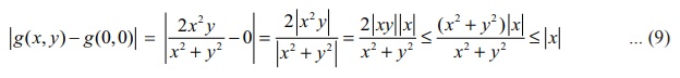 இங்கு கடைசி வரியில் நாம் 2 |xy| ≤ x2 + y2 என்பதை அனைத்து x, y ∈ℝ எனப் பயன்படுத்தியுள்ளதைக் கவனிக்க. (இது 0 ≤ (x - y)2 -இலிருந்து கிடைப்பது) (x,y) → (0,0) என்பதால் |x| → 0 எனக் கிடைக்கின்றது. சமன்பாடு (9)-லிருந்து