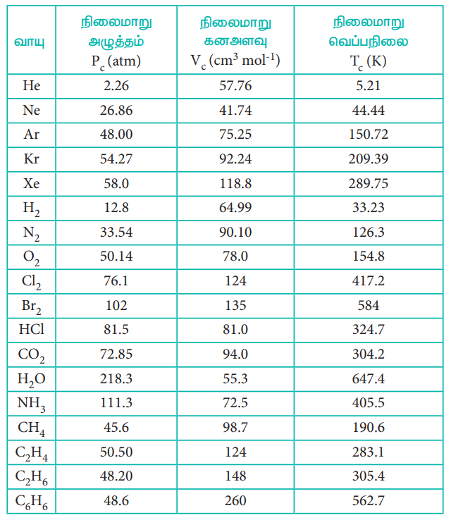 11th Chemistry : List of Critical constants of selected gases Chemistry in Tamil : 11th Standard
