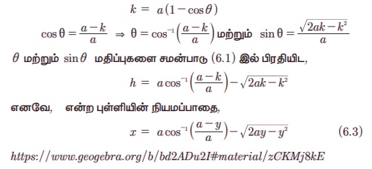 எடுத்துக்காட்டு 6.6 நகரும் புள்ளியின் ஆயக்கூறு (a ( θ – sin θ ), a (1- cos θ )) இங்கு θ என்பது துணையலகு எனில், இப்புள்ளி நகரும் நியமப்பாதையின் சமன்பாட்டைக் காண்க.