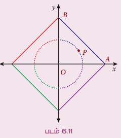 எடுத்துக்காட்டு 6.5 நீளம் 6 அலகுகள் கொண்ட ஒரு நேரான கம்பியின் முனைகள் A மற்றும் B ஆனது முறையே எப்போதும் x மற்றும் y-அச்சுகளைத் தொடுமாறு நகர்கிறது. O-ஐ ஆதியாகக் கொண்ட Δ OAB என்ற முக்கோணத்தின் நடுப்புள்ளியின் (centroid) நியமப்பாதையின் சமன்பாட்டைக் காண்க