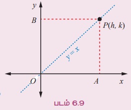 எடுத்துக்காட்டு 6.1 x -அச்சிலிருந்து உள்ள தொலைவானது y -அச்சுலிருந்து உள்ள தொலைவுக்கு சமமாக இருக்குமாறு நகரும் ஒரு புள்ளியின் நியமப்பாதையைக் காண்க.