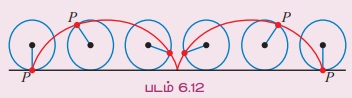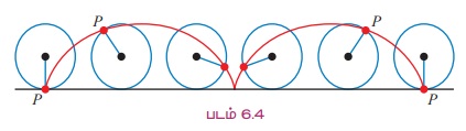 விளக்க எடுத்துக்காட்டு 6.2 P என்ற ஒரு புள்ளியானது ஒரு வட்டத்தின் விளிம்பில் உள்ளது என்க. அந்த வட்டமானது ஒரு நேர்க்கோட்டின் மீது சறுக்கி (நழுவி) செல்லாமல் உருண்டு செல்கிறது. அவ்வாறு உருண்டு செல்லும்போது வட்டத்தின் விளிம்பில் உள்ள P என்ற புள்ளி உருவாக்கும் நியமப்பாதையை உருள்வளை (cycloid) என அழைக்கலாம். இவ்வளைவரையை www.mathuorld. wolfram.com/cgloid மற்றும் (uuu.gogebra.org/b/bd2ADu2I வளைதளத்தில் காணலாம்.