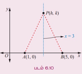 எடுத்துக்காட்டு 6.3 A(1, 0) மற்றும் B(5,0) என்ற புள்ளிகளிலிருந்து சம தூரத்திலிருக்குமாறு நகரும் புள்ளியின் நியமப்பாதையின் சமன்பாட்டைக் காண்க.