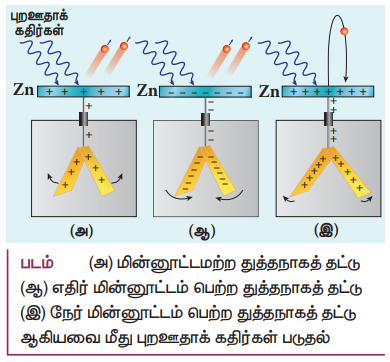 இ) நேர் மின்னூட்டம் பெற்ற துத்தநாகத் தட்டு ஆகியவை மீது புறஊதாக் கதிர்கள் படுதல்