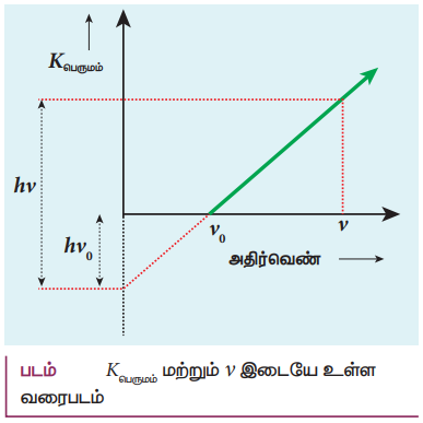 • Kபெருமம் = hv − ϕ0 என்ற சமன்பாட்டில் இருந்து Kபெருமம் ஆனது அதிர்வெண் v விற்கு நேர்தகவில் அமையும். ஆனால் ஒளிச்செறிவினைப் பொருத்து அமையாது.