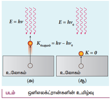 • hv = hvo + ½ mv2 என்ற சமன்பாட்டிலிருந்து, உலோகப் பரப்பில் இருந்து எலக்ட்ரானை வெளியேற்ற உலோகத்தின் வெளியேற்று ஆற்றலுக்கு சமமாக போட்டானின் ஆற்றல் இருக்க வேண்டும்.