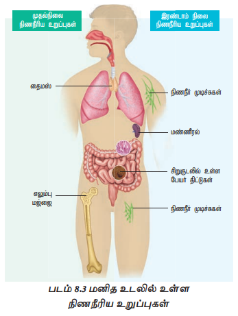 நோய்த்தடைகாப்பு மண்டலத்தைச் சேர்ந்த, அமைப்பிலும் மற்றும் பணியிலும் வேறுபட்ட பல உறுப்புகள் மற்றும் திசுக்கள் உடல் முழுவதும் பரவியுள்ளன. லிம்போசைட்டுகளின் தோற்றம், முதிர்ச்சி மற்றும் பெருக்கம் ஆகியவற்றில் பங்கேற்கும் உறுப்புகள் நிணநீரிய உறுப்புகள் என அழைக்கப்படுகின்றன (படம் 8.3).