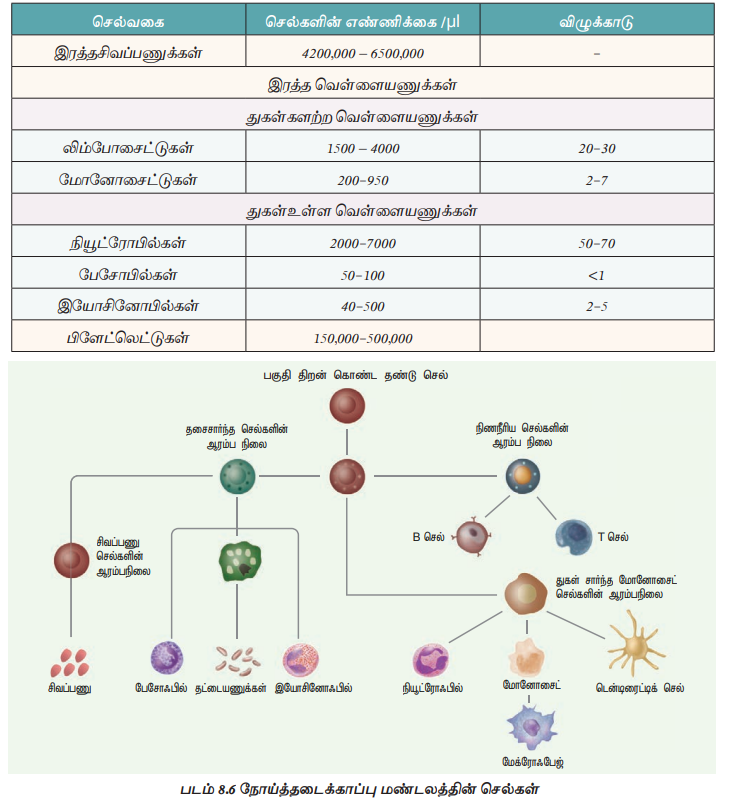 நோய்த் தடைக்காப்பு மண்டலம் ஒன்றை ஒன்று சார்ந்த பல செல்களால் ஆக்கப்பட்டுள்ளன. இச்செல்கள் நுண்கிருமிகள் மற்றும் புற்றுநோய் கட்டி செல்களின் வளர்ச்சி ஆகியவற்றிடமிருந்து உடலை பாதுகாக்கின்றன. வளர்ந்த மனிதனின் இரத்ததில் உள்ள செல் பொருட்களை அட்டவணை 8.4 ல் காணலாம்.