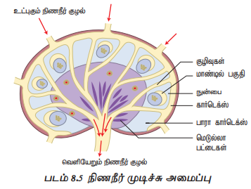 கார்டெக்ஸ், பாராகார்டெக்ஸ் மற்றும் மெடுல்லா ஆகிய மூன்று அடுக்குகள் நிணநீர் முடிச்சில் உள்ளன (படம் 8.5). வெளி அடுக்கான கார்டெக்ஸில் B-லிம்போசைட்டுகள், மேக்ரோ பேஜ்கள், நுண்பை டென்டிரைட்டிக் செல்கள் ஆகியவை உள்ளன. கார்டெக்ஸுக்கு கீழே உள்ள பகுதி பாராகார்டெக்ஸ் ஆகும். இதில் ஏராளமான T-லிம்போசைட்டுகள் மற்றும் விரலமைப்பு கொண்ட டென்டிரைட்டிக் செல்கள் ஆகியவை உள்ளன. மெடுல்லாவின் உள்பகுதியில் குறைந்த அளவிலான B-லிம்போசைட்டுகள் உள்ளன. ஆனால் அதில் பெரும்பாலானவை எதிர்பொருள் மூலக்கூறுகளை உற்பத்தி செய்யும் பிளாஸ்மா செல்களாகும். நிணநீர் முடிச்சு பகுதிகளான கார்டெக்ஸ், பாராகார்டெக்ஸ் மற்றும் மெடுல்லா பகுதி வழியாக நிணநீர் மிக நிதானமாக செல்லும் போது விழுங்கு செல்கள் மற்றும் டெண்ரைட்டிக் செல்கள் நிணநீர் வழியாக வரும் எதிர்ப்பொருள் தூண்டிகளை வடிகட்டுகின்றன. நிணநீர் முடிச்சை விட்டு நிணநீர் வெளியேறும் போது நிணநீர் முடிச்சுகளுக்குள் நுழைந்த எதிர்ப்பொருள் தூண்டிக்கு எதிராக மெடுல்லாவின் பிளாஸ்மா செல்கள் சுரந்த ஏராளமான எதிர்ப்பொருட்களை தன்னுடன் எடுத்துச் செல்கிறது. லிம்போசைட்டுகளின் எண்ணிக்கை அதிகரிக்கும் போதும் தடைக்காப்பு துலங்கலை ஆற்றலுடன் செயல்படுத்தும் போதும் நிணநீர் முடிச்சுகள் வீங்குவதை தெளிவாக காணமுடிகிறது. இவ்வீக்கம் நோய் தொற்றின் அறிகுறியாகும். உடலெங்கும் நிணநீர் முடிச்சுகள் பலகுழுக்களாக உள்ளன. அடிக்கடி வீங்கும் நிணநீர் முடிச்சுகள் கழுத்து, கீழ்தாடை, கக்கங்கள் (armpits) மற்றும் தொடை இடுக்கு ஆகிய பகுதிகளில் காணப்படுகின்றன.