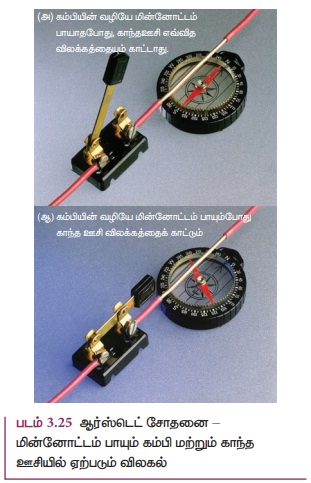 கம்பியின் வழியே பாயும் மின்னோட்டம் அருகே இருந்த திசைகாட்டும் காந்தக் கருவியில் விலகலை