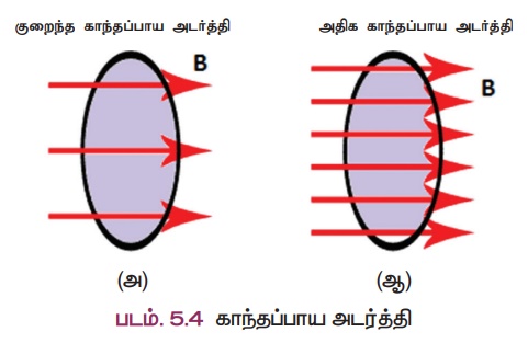காந்தவிசைக் கோடுகளுக்குச் செங்குத்தாக அமைந்த ஓரலகு பரப்பைக் கடந்து செல்லும் காந்தவிசைக் கோடுகளின் எண்ணிக்கை காந்தப் பாய அடர்த்தி என்று அழைக்கப்படும். இது படம் 5.4 இல் காட்டப்பட்டுள்ளது. இதன் அலகு Wb/m2 ஆகும்