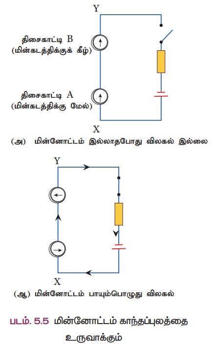 B எனும் புள்ளியில் கம்பியின் மீது வைக்கப்பட்ட திசைகாட்டி மேற்கு நோக்கியும்விலகலடைந்தன (படம்5.5).