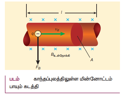 • மின்னோட்டம் பாயும் கடத்தி ஒன்றை காந்தப் புலத்தில் வைக்கும் போது, கடத்தி உணரும் விசை மின்துகளின் மீது செயல்படும். லாரன்ஸ் விசையின் கூடுதலுக்குச் சமம்.