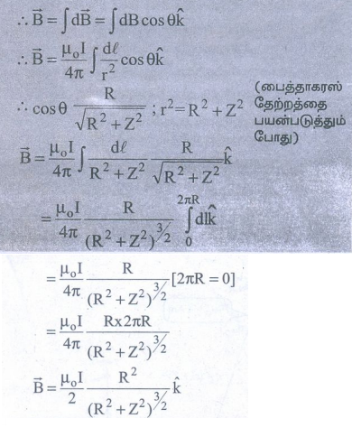 3. பயோட்−சாவர்ட் விதி உதவியுடன் மின்னோட்டம் பாயும் வட்டவடிவக் கம்பிச் சுருளின் அச்சில் ஒரு புள்ளியில் ஏற்படும் காந்தப்புலத்துக்கான கோவையைப் பெறுக.