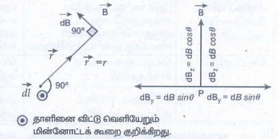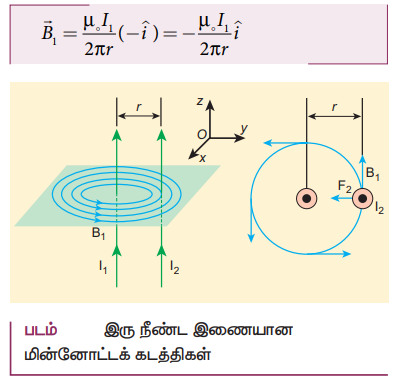 • A கடத்தியில் I1 மின்னோட்டத்தினல் r தொலைவில் ஏற்படும் நிகர காந்தப்புலம்