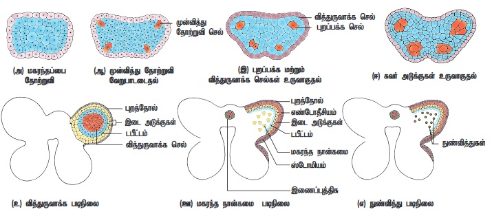 ஒருமடிய நுண்வித்துகளைத் தோற்றுவிக்கின்றன (நான்கமை நுண்வித்து). இந்த நான்கமை வித்துக்கள் நான் முகப்பு , குறுக்கு மறுக்கு , நேர்கோட்டு, இருமுகப்பு , T வடிவ அமைப்பில் உள்ளது. நுண்வித்துக்கள் விரைவில் ஒன்றிலிருந்து மற்றொன்று பிரிந்து தனித்தனியாக மகரந்தப்பை அறையில் காணப்படுகின்றன மற்றும் மகரந்தத்துகள்களாக வளர்கின்றன. நுண்வித்தகங்களின் வளர்ச்சியிலுள்ள படிநிலைகள் படம் 1.4-ல் கொடுக்கப்பட்டுள்ளன. சில தாவரங்களில் ஒரு நுண்வித்தகத்திலுள்ள நுண்வித்துகள் அனைத்தும் ஒன்றாக இணைந்து பொலினியம் (pollinium) என்ற அமைப்பை பெற்றுள்ளது. எடுத்துக்காட்டு: எருக்கு . கூட்டு மகரந்தத்துகள் டுரோசீரா, டிரைமிஸ் ஆகிய தாவரங்களில் காணப்படுகின்றன.