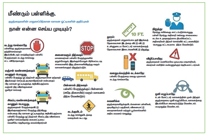 • மற்ற வாகனங்களுக்குத் தேவையில்லாமல் ஆபத்து மற்றும் இடையூறு ஏற்படுவதைத் தவிர்க்கும் பொருட்டு பள்ளிப் பேருந்தின் முன்பக்கமாக இறங்கவும்.
