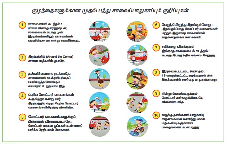 6வயதுக்குட்பட்ட குழந்தைகளுக்கு உடனிருப்போர் அவசியம். அக்குழந்தைகள் சாலையைக் கடக்கும்போது கட்டாயமாக அவர்களின் கையைப் பிடித்துக் கொள்ள வேண்டும்.