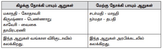 2. தீபகற்ப இந்தியாவில் கிழக்கு நோக்கி பாயும் ஆறுகளையும், மேற்கு நோக்கி பாயும் ஆறுகளையும் அட்டவணைப்படுத்தவும்.