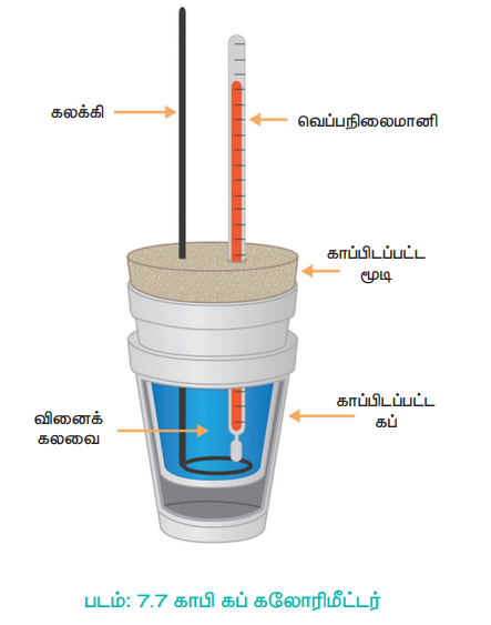 மாறாத அழுத்தத்தில் நடைபெறும் (பொதுவாக வளிமண்டல அழுத்தத்தில்) வினைகளில் நிகழும் வெப்ப மாற்றங்களை காஃபி கப் கலோரி மீட்டர் கொண்டு அளவிடலாம். காஃபி கப் கலோரி மீட்டரின் அமைப்பை குறித்துக் காட்டும் படமானது, படம் (7.7) ல் கொடுக்கப்பட்டுள்ளது. இந்த கலோரி மீட்டரில் உலோக கலனிற்கு (பாம்) பதிலாக ஸ்டைரோபோஃம் கப் பயன்படுத்தப்படுகிறது. இது சிறந்த வெப்பம் கடத்தாப் பொருள், வினையில் உருவாகும் வெப்பத்தை சூழலுக்கு கடத்த இப்பொருள் அனுமதிப்பதில்லை. எனவே இங்கு உருவான மொத்த வெப்பமும், கப்பில் உள்ள நீரால் மட்டுமே உறிஞ்சப்படுகிறது. நீரின் வெப்பநிலையில் ஏற்படும் மாற்றமானது அளந்தறியப்படுகிறது, மேலும் இதனைப் பயன்படுத்தி உறிஞ்சப்பட்ட (அ) வெளியிடப்பட்ட வெப்பத்தின் அளவை, பின்வரும் சமன்பாட்டினை பயன்படுத்தி கணக்கிடலாம்.
