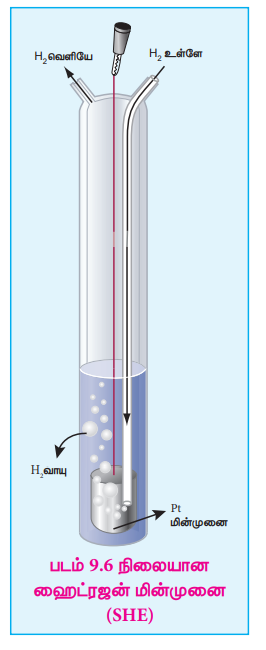 இந்த நோக்கத்திற்காக, திட்ட ஹைட்ரஜன் மின்முனையானது (SHE) நோக்கீட்டு மின்முனையாக (reference electrode) பயன்படுத்தப்படுகிறது. இதன் emf மதிப்பு தன்னிச்சையாக பூஜ்ஜியம் வோல்ட் என நிர்ணயிக்கப்பட்டது. இது, 1M HCl கரைசல் மற்றும் 1 atm ஹைட்ரஜன் வாயுவுடன் தொடர்பிலுள்ள பிளாட்டின மின்முனையை கொண்டுள்ளது. படம் 9.6 ல் காட்டியுள்ளவாறு 25oC வெப்பநிலையில் ஹைட்ரஜன் வாயுவானது கரைசலின் வழியே குமிழிகளாக செலுத்தப்படுகிறது. SHE எதிர்மின்முனையாகவும், நேர்மின்முனையாகவும் செயல்பட முடியும். அரைக் கலவினைகள் கீழே கொடுக்கப்பட்டுள்ளன.