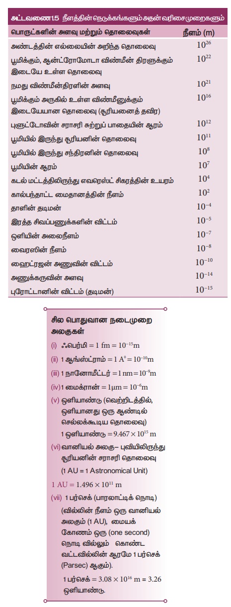 நீளத்தின் நெடுக்கங்களும் அதன் வரிசை முறைகளும் அட்டவணை 1.5 இல் காட்டப்பட்டுள்ளது