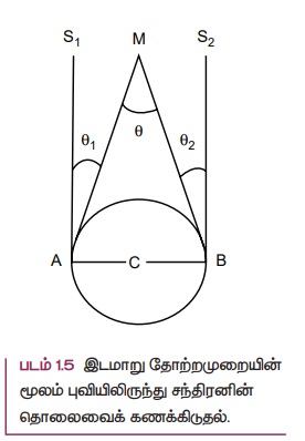 வானியல் தொலை நோக்கியின் உதவியால் A மற்றும் B யிலிருந்து அருகில் உள்ள விண்மீனுக்கும் சந்திரனுக்கும் (M) இடையேயான இடமாறு தோற்றக்கோணம் முறையே θ1 மற்றும் θ2 கண்டறியப்படுகிறது. எனவே, புவியிலிருந்து நிலவின் மொத்த இடமாறு தோற்ற கோணம்