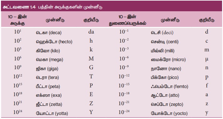 அணு மற்றும் வானியல் தொலைவுகளை மேற்கூறிய எந்த ஒரு நேரடியான முறையிலும் அளக்க இயலாது. எனவே, மிகச் சிறிய மற்றும் நீண்ட தொலைவுகளை அளக்க சில மாற்று முறைகள் உருவாக்கப்பட்டு பயன்படுத்தப்படுகின்றன. அட்டவணை 1.4 இல் 10 இன் அடுக்குகள் (நேர்மறை மற்றும் எதிர்மறை) அட்டவணைப்படுத்தப்பட்டுள்ளன.