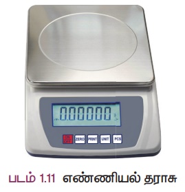 தற்காலத்தில் பொருளின் நிறையைக் கணக்கிட மிகத் துல்லியத் தன்மையுடன் கூடிய எண்ணியல் தராசைப் பயன்படுத்துகின்றனர். பொருளின் நிறையைமில்லிகிராம் அளவிற்கு மிகத் துல்லியமாக அளவிடுகிறார்கள். இக்கருவியின் மீச்சிற்றளவு 10 மி.கி அளவிற்கு இருக்கிறது (படம் 1.11). இத்தகைய தராசுகளைக் கையாள்வது எளிது. இவை, ஆய்வகங்கள் மற்றும் நகைக் கடைகளில் பயன்படுத்தப்படுகின்றன.