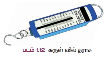 சுருள் வில் தராசு பொருளின் எடையைக் கணக்கிடப் பயன்படுகிறது. இக்கருவி உலோக உள்ளீடற்ற சட்டத்தினுள் எஃகு சுருள்வில்லைப் பொருத்தி அமைக்கப்பட்ட அமைப்பாகும். இதன் மேல் முனை நிலையான வளையத்தோடு பொருத்தப்பட்டிருக்கும். அதன் கீழ் முனையானது பொருளோடு பொருந்தக் கூடிய வளையத்தோடு இணைக்கப் பட்டிருக்கும். இது சுருள்வில்லில் கொடுக்கப்படும் விசையானது நிலையான புள்ளியிலிருந்து சுருள்வில் விரிவடையும் தொலைவிற்கு நேர் தகவில் அமையும்" என்ற ஹூக்ஸ் விதிப்படி இயங்குகிறது (படம் 1.12). குறிமுள் ஒன்று அளவுகோல் மீது நகர்ந்து செல்லும் சட்டத்தின் மீது வலது புறத்தில் இணைக்கப்பட்டுள்ளது. பொருளின் எடைக்கேற்ப சுருள்வில் விரிவடையும்போது தராசின்வலப்பக்கம் உள்ள அளவுகோலில் அளவீட்டை குறிமுள் காட்டும். இதுவே அப்பொருளின் எடையாகும்.
