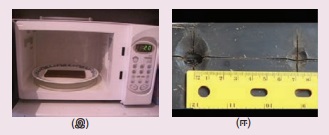 நிலை அலைகளைப்பற்றி நாம் +1 வகுப்பு தொகுதி இரண்டு, அலகு 11 - இல் பயின்றோம். நிலை அலைகள் கணுக்கள் மற்றும் எதிர்க்கணுக்களை குறிப்பிட்ட புள்ளிகளில் பெற்றிருக்கும். கணுப்பகுதியில் அலையின் வீச்சு சுழியாகும். எதிர்க்கணுவில் அலையின் வீச்சு பெருமமாகும். வேறுவகையில் கூறுவோமாயின் மைக்ரோ அலையின் பெரும ஆற்றல் எதிர்கணுப்பகுதியில் அமைந்துள்ளது. சமையல்கலனின் உட்புறம் உள்ள சுழலும் மேடையை நீக்கிவிட்டு சப்பாத்தி அல்லது சாக்லேட் போன்ற உணவுப்பொருளை வைக்கும்போது எதிர்கணுப்பகுதிகள் மற்ற பகுதிகளைவிட அதிகம் சூடாகியிருப்பதைக் காணலாம். இது படம் (இ) மற்றும் (ஈ) யில் காட்டப்பட்டுள்ளது. அதிகம் சூடாகியுள்ள இரண்டு! அடுத்தடுத்த பகுதிகளுக்கு இடையேயுள்ள தொலைவு மைக்ரோ அலையின் அரை அலை நீளத்தைக் கொடுக்கும். மைக்ரோ அலையின் அதிர்வெண் சமையல்கலனில் பதிவு செய்யப்பட்டிருக்கும். மைக்ரோ அலையின் அலைநீளம் மற்றும் அதிர்வெண் தெரிந்தால் v pppppppp = c என்ற சமன்பாட்டினைப் பயன்படுத்தி ஒளியின் வேகத்தைக் கணக்கிடலாம்.