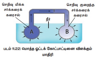 அரைகடத்தி சவ்வினால் ஆன "A" மற்றும் "B" எனப்படும் இரு அறைகள் ஒரு நீர்த்தொட்டியில் மூழ்கியுள்ளன. இந்த இரு அறைகளும் "T" எனும் குழாய் மூலம் இணைக்கப்பட்டுள்ளன. "A" அறையில் செறிவு அதிகம் உடைய சர்க்கரைக் கரைசலும் "B" எனும் அறையில் செறிவு குறைந்த சர்க்கரைக் கரைசலும் உள்ளது. கீழ்காணும் மாற்றங்கள் இவ்வமைப்பில் ஏற்படுவதை உற்றுநோக்கலாம்.