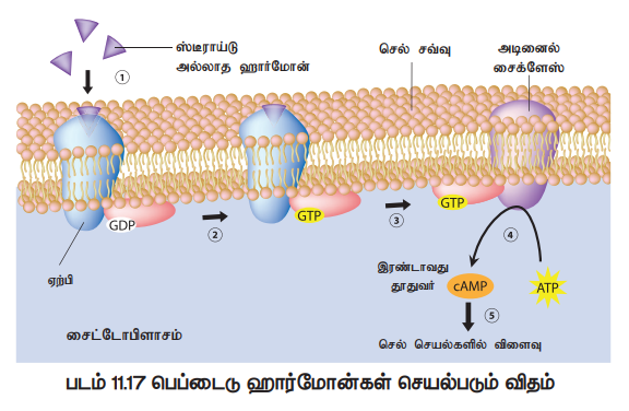 பெப்டைடுஹார்மோன்கள், பாஸ்போலிபிட் செல் சவ்வை கடக்க இயலாது. இவை செல் பரப்பிலுள்ள உணர்வேற்பிகளுடன் இணைந்து மாற்றமடையும் இடமான கோல்கை உறுப்புகளுக்கு அனுப்பப்படுகின்றது. இது முதலாம் தூதுவர்களாகச் செயல்படுகிறது. உணர்வேற்பிகளுடன் இணைந்த ஹார்மோன்கள் இலக்கு செல்லுக்குள் நுழைவதில்லை. ஆனால், இதன் விளைவாக சைக்ளிக் அடினோசின் மோனோ பாஸ்பேட் (cAMP) போன்ற இரண்டாம் தூதுவர்களின் உற்பத்தி தூண்டப்படுகின்றன. இச்செயல் செல் வளர்சிதை மாற்றத்தை ஒழுங்குப்படுத்துகிறது. இம் மாற்றத்தினை அடினைலேட் சைக்லேஸ் (Adenylate cyclase) எனும் நொதி தூண்டுகின்றது. செல்சவ்வில் ஒட்டியுள்ள ஹார்மோன் மற்றும் செல்லினுள் CAMP-யால் ஏற்பட்டுள்ள விளைவு ஆகியனவற்றின் இடையேயுள்ளதொடர்பு சமிக்ஞைதொடரிணைவு (குறியனுப்பல் பொழிவு) ஆகும். இதன் ஒவ்வொரு படிநிலையிலும் சமிக்ஞை பெருக்கமடைய வாய்ப்புள்ளது (படம் 11.17).