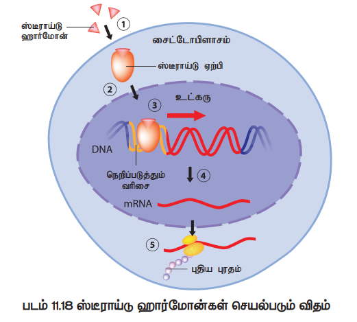 ஸ்டீராய்டு ஹார்மோன்கள் எளிதில் செல் சவ்வைக் கடந்து, செல்லின் அக உணர்வேற்பிகள் அல்லது உட்கரு அக உணர்வேற்பிகளுடன் இணைகின்றன (படம்11.18). உணர்வேற்பிகளுடன் இணையும் வேளையில், இவை, வேறொரு உணர்வேற்பி-ஹார்மோன் கூட்டமைப்போடு இணைவை (receptor hormone complex (dimerize) உருவாக்குகின்றன. இந்த டைமர், DNA உடன் இணைந்து DNA வின் படியெடுத்தல் நிகழ்வை மாற்றுகின்றது.