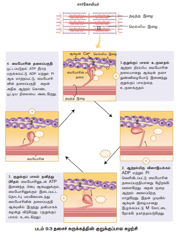 இவ்விசைத்தாக்கத்தின் முடிவில் மையோசின் தலைப்பகுதியில் இருந்து ஆக்டின் இழைகள் விடுவிக்கப்படுகின்றன. மையோசின் மீண்டும் சுழன்று அடுத்த ஆக்டினோடு இணைந்து அடுத்த சுருக்க சுழற்சிக்குத் தயாராகின்றது. (இந்த இயக்க மானது படகில் பயன்படுத்தப்படும் துடுப்பின் இயக்கத்துக்கு நிகரானது). தசையிழை சுருங்கும் வரை விசைத்தாக்கம் தொடர்ந்து பல முறை நிகழ்கின்றது. ஆக்டின் மூலக்கூறுகளை மையோசினின் தலைப்பகுதி, பிணைத்து, உள்ளே நகர்த்திப் பின் விடுவிக்கின்றது. இந்நிகழ்ச்சி தொடர்ந்து நடைபெறுவதால் மெல்லிழைகள் சார்க்கோமியரின் மையப்பகுதியை நோக்கி நகர்கின்றது. இவ்வாறாகத் தொடர்ந்து குறுக்குப்பாலம் உருவாதலும் உடைதலும் தசையிழைகளில் சறுக்கலை ஏற்படுத்துகின்றன. ஆனால், தடித்த மற்றும் மெல்லிய இழைகளின் நீளத்தில் இதனால் எந்த மாற்றமும் இல்லை. ஆக்டின் இழைகளுடன் இணைந்த Z கோடுகள் இரு பக்கத்தில் இருந்தும் உள்நோக்கி இழுக்கப்படுவதால் சார்கோமியர் நீளம் குறைகின்றது. இதன் முடிவில் சார்கோமியர் சுருங்குகிறது. தசைகளுக்கான தூண்டல் மற்றும் கால்சியம் அயனிகளின் தொடர் வெளியேற்றம் ஆகியவை இருக்கும் வரை இச்சுருக்க நிகழ்வு தொடர்ந்து நடைபெறுகிறது. இயக்கத் தூண்டல் நின்றவுடன், கால்சியம் அயனிகள் சார்கோபிளாசத்தினுள் மீளச்செலுத்தப்படுவதால் ஆக்டின் இழைகளின் செயல்படு பகுதியான இணைப்பிடம் மறைக்கப்படுகின்றது. இதனால் மயோசின் இழைகளின் தலைப்பகுதி ஆக்டின் இழையுடன் இணைய இயலாமையால், Z கோடுகள் பழைய நிலைக்குச் செல்கின்றன. இதற்குத் தசை தளர்வடைதல் என்று பெயர் (படம் 9.3).