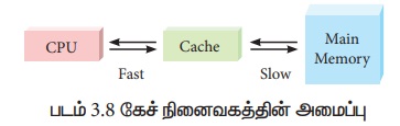 கேச் நினைவகம் அதிவேகமான, விலை உயர்ந்த நினைவகம் ஆகும். நினைவகத்தில் உள்ள தரவைத் திரும்ப எடுத்தலைத் துரிதப்படுத்துவதற்கு பயன்படும் நினைவகம் ஆகும். இதன் விலை கூடுதலாகும். அதனால் மையச் செயலகத்தில் முதன்மை நினைவகத்தின் அளவை விட கேச் நினைவகத்தின் அளவு மிகவும் குறைவாக இருக்கும். கேச் நினைவகம் இல்லையெனில் மையச் செயலகம் ஒவ்வொரு முறையும் தரவு தேவைப்படும்போது அதை முதன்மை நினைவகத்திலிருந்து பெறும். இது அதிக நேரத்தை எடுத்துக் கொள்ளும். கேச் நினைவகம் அறிமுகப்படுத்தப்பட்டதற்கு காரணம், இந்த நினைவகத்தில் அடிக்கடி தேவைப்படும் மற்றும் அணுகக்கூடிய தரவுகள் சேமிக்கப்படும். இது விரைவான பதிலளிப்பு நேரத்தைத் தக்க வைக்க உதவுகிறது. அங்கு இயக்க நேரம் (Access Time) நினைவகம் படிக்க எழுத கோரிக்கைக்கு எவ்வளவு விரைவாக பதிலளிக்க முடியும் என்பதை குறிக்கின்றது. படம் 3.8ல் மையச் செயலகத்திற்கும் முதன்மை நினைவகத்திற்கும் இடையே அமைக்கப்பட்டுள்ள கேச் நினைவகத்தைக் காணலாம்.