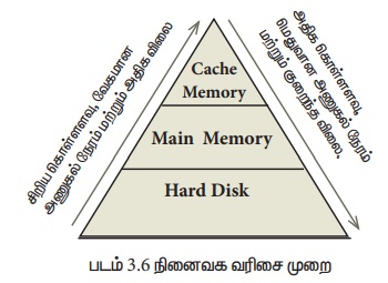 கணிப்பொறி நினைவகம் என்பது மனித மூளையைப் போன்றதாகும். கணிப்பொறி நினைவகம் தரவுகளையும் கட்டளைகளையும் சேமித்து வைக்கப் பயன்படுகிறது. நினைவகத்தில் சேமித்து வைக்கப்பட்ட தரவு மற்றும் கட்டளைகள் இரண்டு வகையில் கையாளப்படுகின்றது (படிக்க / எழுத), அவை தொடர்ச்சியான மற்றும் நேரடி அணுகல் முறையாகும். தொடர்ச்சியான அணுகல் முறையில் நினைவகம் முதலிலிருந்து கடைசிவரை ஒவ்வொன்றும் வரிசையாக அணுகும். ஆனால் நேரடி அணுகல் முறையில் நினைவகம் ஒவ்வொன்றாக அணுகுவதற்கு பதிலாக நேரடியாக அணுகும். படம் 3.6ல் பலவகையாக நினைவகச்சாதனங்கள், அதன் கொள்ளளவு, வேகம் மற்றும் விலையின் அடிப்படையில் வரிசைப்படுத்தப்பட்டுள்ளது.