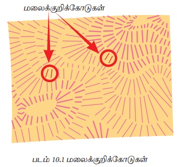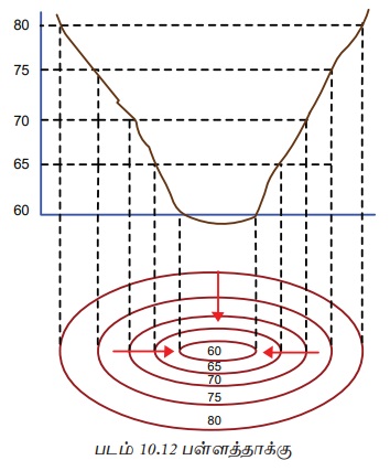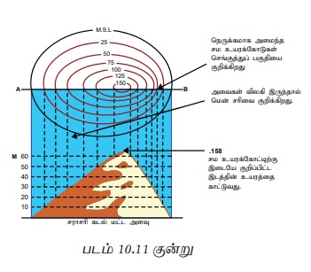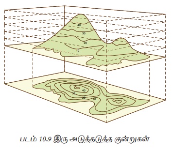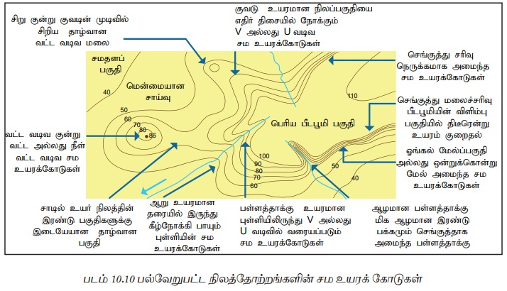 படம் 10.10 சமஉயரக் கோடுகளால் காட்டப்படும் பொதுவான அம்சங்களை வழங்குகிறது.