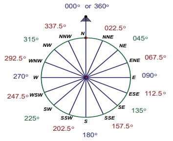 படி 3 பாகைமானியின் உதவியுடன் திசைகளைக் படத்திலுள்ளதைப் போல குறிக்கவும்.(0-வடக்கிற்கும், 45° வடகிழக்கு, 90 கிழக்கு 135° தென்கிழக்கு, 180° - தெற்கு, 225° - தென்மேற்கு, 270° மேற்கு 315°வடமேற்கு)