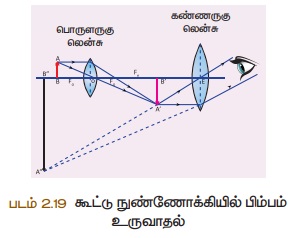 குறிப்பிட்ட அளவிற்கு மேல் குறைக்க இயலாது. எனவே கூட்டு நுண்ணோக்கியில், உருப்பெருக்கத்தை அதிகரிப்பதற்காக இரண்டு குவிலென்சுகள்