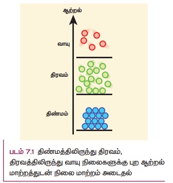 ஒரு திரவமானது மாறா அழுத்தத்தில் அதன் கொதிநிலைக்கு வெப்பப்படுத்தப்பட்டாலோ, அல்லது ஒரு மாறா வெப்பநிலையில் அதன் அழுத்தம் குறைக்கப்பட்டாலோ அது வாயுவாக மாறும். திரவமானது வாயுவாக மாறும் இந்தச் செயல் முறை ஆவியாதல் எனப்படும். வாயு மூலக்கூறுகள் மிகவும் வலுவற்ற பிணைப்புகளைக் கொண்டிருக்கும் அல்லது பிணைப்புகளே இருக்காது. எனவே வாயுவானது அதன் கொள்கலனின் வடிவத்திற்கு இணங்கி விரிவடைந்து கொள்கலனை நிரப்பும். திண்மத்திலிருந்து திரவம் மற்றும் திரவத்திலிருந்து வாயு நிலைக்கு புற ஆற்றல் மாறுபாட்டுடன் நிலைமாற்றம் அடைவதைப் படம் 7.1 இல் திட்ட வரைபடமாக காண்பிக்கப்பட்டுள்ளது.