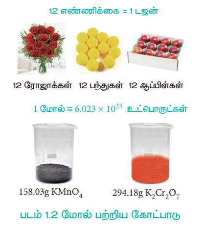 மோல் பற்றிய கோட்பாட்டினைப் புரிந்து கொள்வதற்கு, 12g கார்பன்-12 ஐசோடோப்பில் காணப்படும் அணுக்களின் எண்ணிக்கை, 158.03g பொட்டாசியம் பெர்மாங்கனேட் மற்றும் 294.18g பொட்டாசியம் டைகுரோமேட்டில் காணப்படும் மூலக்கூறுகளின் எண்ணிக்கையினை நாம் கணக்கிடுவோம்.