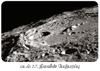சந்திரனானது புவியிலிருந்து 8,84,401 கி.மீட்டர் தொலைவில் அமைந்துள்ளது.(படம் 2.7) சந்திரன் தன்னைத்தானே சுற்றுவதற்கும் புவியைச்சுற்றி வருவதற்கும் ஒரே நேரத்தை அதாவது 27 நாட்கள் மற்றும் 7 மணி 43 நிமிடங்கள் எடுத்துக்கொள்வதால், புவியில் இருந்து பார்க்கும்போது சந்திரனின் ஒரு பக்கத்தை மட்டுமே காணமுடிகிறது. சந்திரனானது சூரியக் குடும்பத்தில் ஐந்தாவது பெரிய துணைக்கோளாகும். செவ்வாய் அளவு நிறையுடைய பொருள் புவியை மோதியதால் இது உருவாகி இருக்கலாம் எனக் கருதப்படுகிறது. சந்திரனின் மேற்பரப்பில் நிழலை உருவாக்கும் பள்ளங்களும் செங்குத்தான வெவ்வேறு அளவிலான மலைகளும் காணப்படுகின்றன. சந்திரனில் பட்டு எதிரொளிக்கப்படும் ஒளியானது 1/4 வினாடிகளில் புவியை வந்தடைகிறது. சந்திரன் புவியை விட சிறியது என்பதால் அதன் ஈர்ப்பு சக்தி புவியின் ஈர்ப்பு சக்தியில் 1/6 மடங்கு மட்டுமே. எனவே, மனிதர்கள் சந்திரனில் புவியை விட 6 மடங்கு எடை குறைவாக இருப்பார்கள்.
