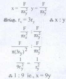 1. x மற்றும் y என்ற இரு கம்பிகளைக் கருதுக. X கம்பியின் ஆரமானது y கம்பியின் ஆரத்தைப்போல 3 மடங்கு உள்ளது. அவை சமமான பளுவால் நீட்டப்பட்டால் y - இன் மீதான தகைவு