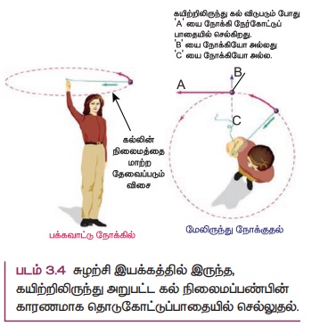 கயிற்றின் ஒரு முனையில் கட்டப்பட்ட, சுழற்சி இயக்கத்திலுள்ள கல்லானது கயிறு திடீரென்று அறுபட்டால், தொடர்ந்து வட்டப்பாதையில் சுற்ற முடியாது. அக்கல் படம் 3.4 இல் காட்டியுள்ளவாறு வட்டத்தின் தொடுகோட்டுப்பாதையில் செல்லும். ஏனெனில் வெளிப்புறவிசை செயல்படாதவரை பொருளினால் தானே தன்னுடைய இயக்கத்திசையை மாற்றிக்கொள்ள இயலாது.