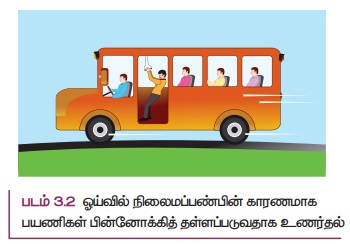 ஓய்வு நிலையிலுள்ள பேருந்து ஒன்று இயங்கத்தொடங்கும் போது அப்பேருந்தில் உள்ள பயணிகள் நிலைமத்தின் காரணமாக திடீரென்று பின்னோக்கித் தள்ளப்படுகின்றனர். ஏனெனில் பயணியின் உடல் நிலைமப்பண்பின் காரணமாக தொடர்ந்து ஓய்வுநிலையிலேயே இருக்க முயல்கிறது. ஆனால் பேருந்து இயங்கத் தொடங்குகிறது. இதன் காரணமாகவே பயணிகளின் உடல் பின்னோக்கித் தள்ளப்படுவதாகத் தோன்றுகிறது. (படம் 3.2)